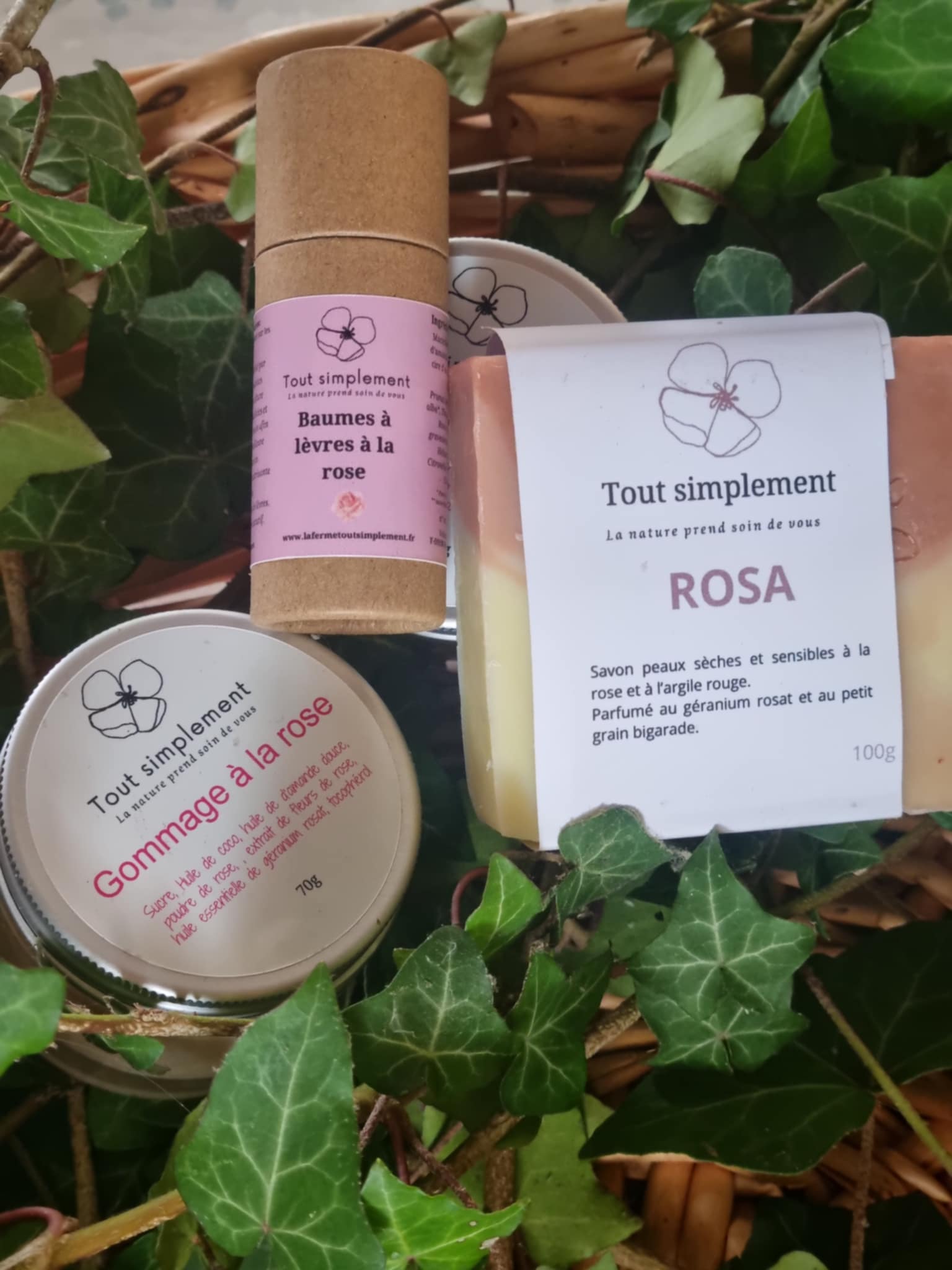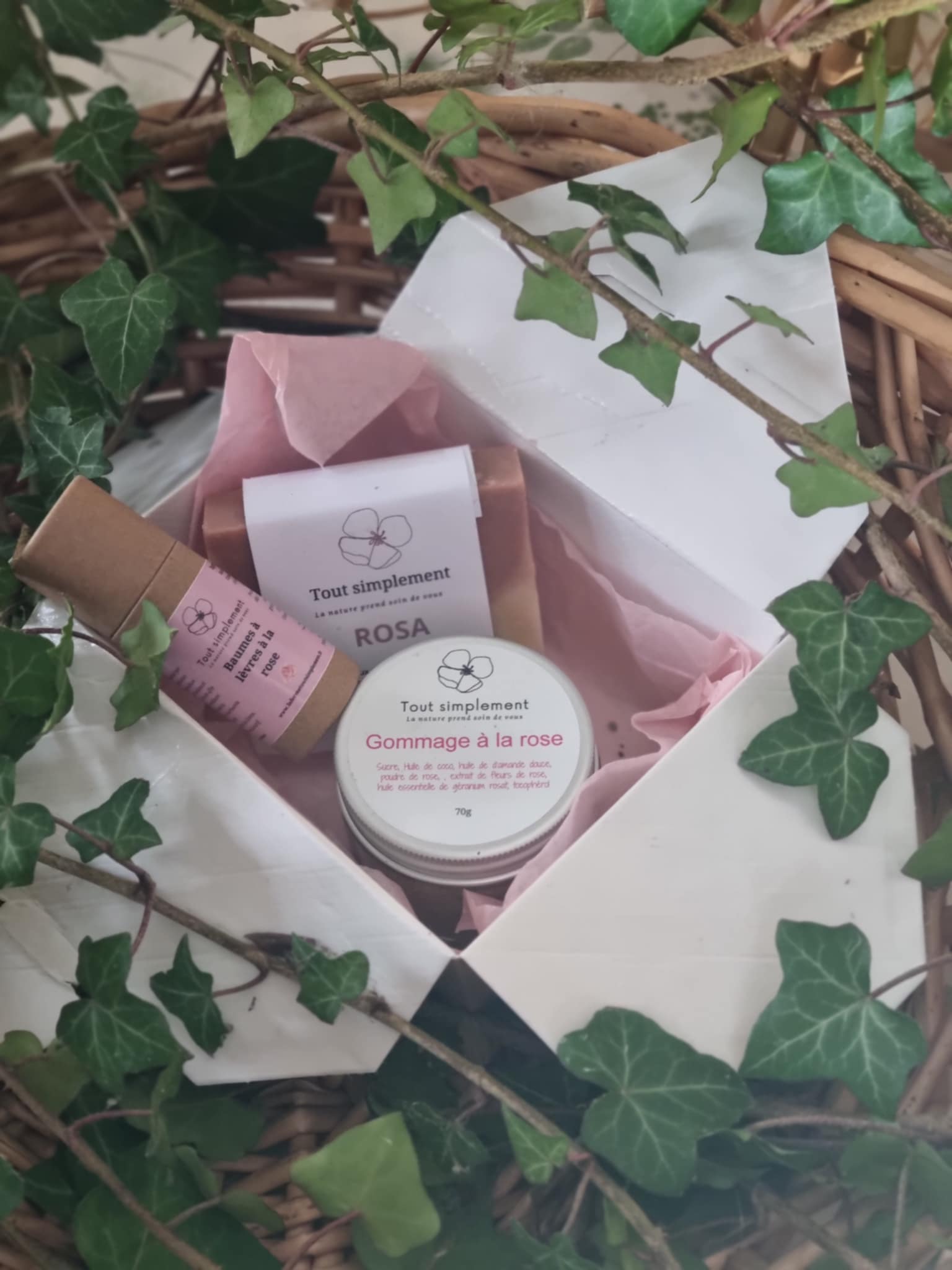 Coffret Fan de rose avec 1 baume à lèvre à la rose, 1 savon ROSA, 1 gommage à la rose.